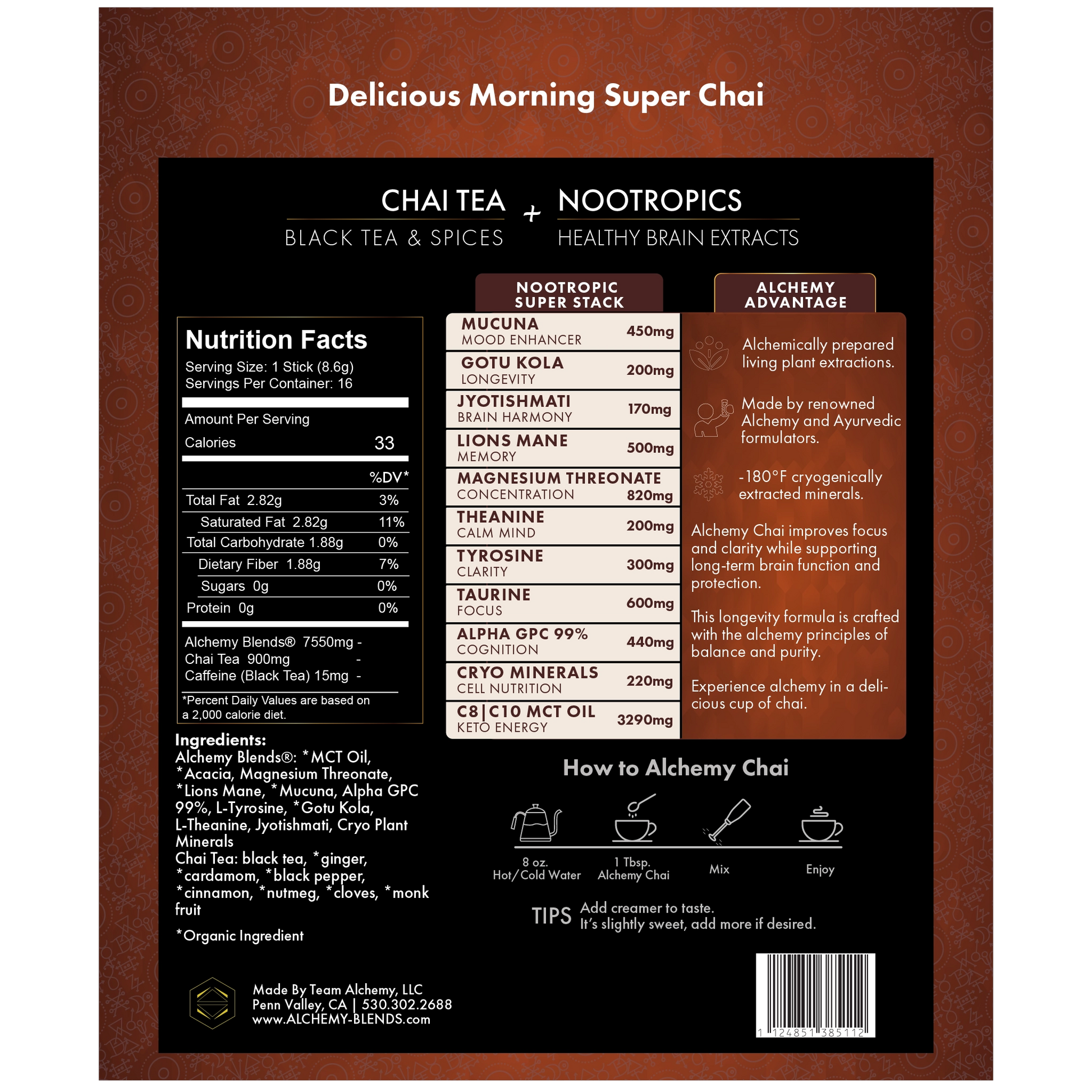 Alchemy Blends was formulated to be an addition to your daily brew, whether it’s coffee, chai, cocao, or even smoothies. You may find that it may satisfy your need for energy drinks or even other nootropics.